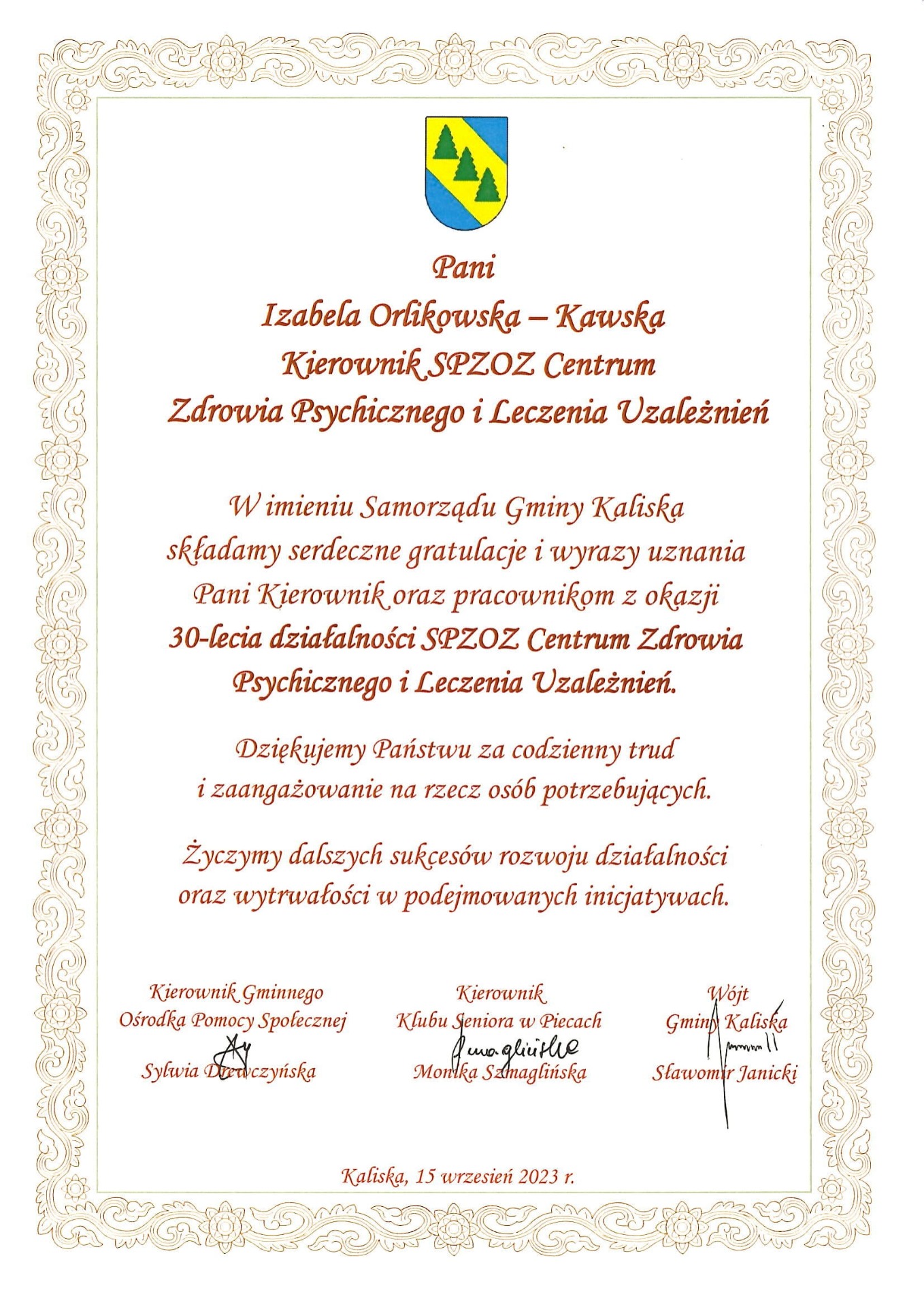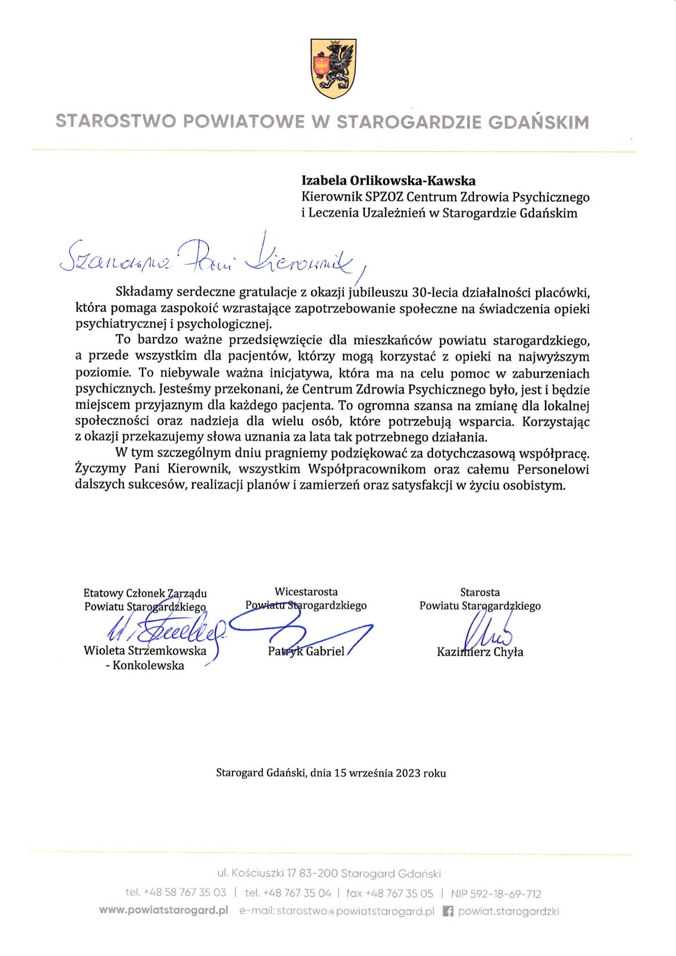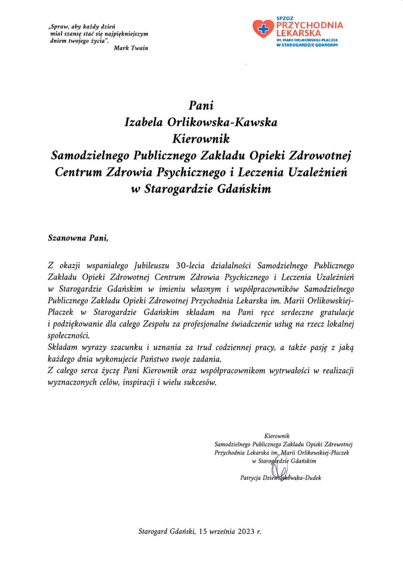 Gratulacje z okazji Jubileuszu 30 lecia placówki